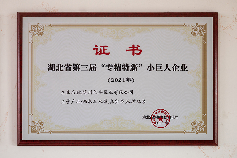 隨州億豐泵業有限公司位于隨州市曾都經濟開發區,建筑面積15000平方米,公司現有大學文憑以上的35人、技術人員25人(高級職稱5人、中級職稱以上27人)。公司自成立以來先后獲得高新技術企業、“專精特新”小巨人企業、隱形冠軍、著名商標等一系列榮譽。